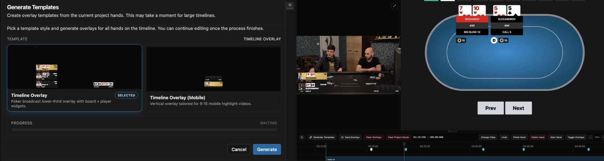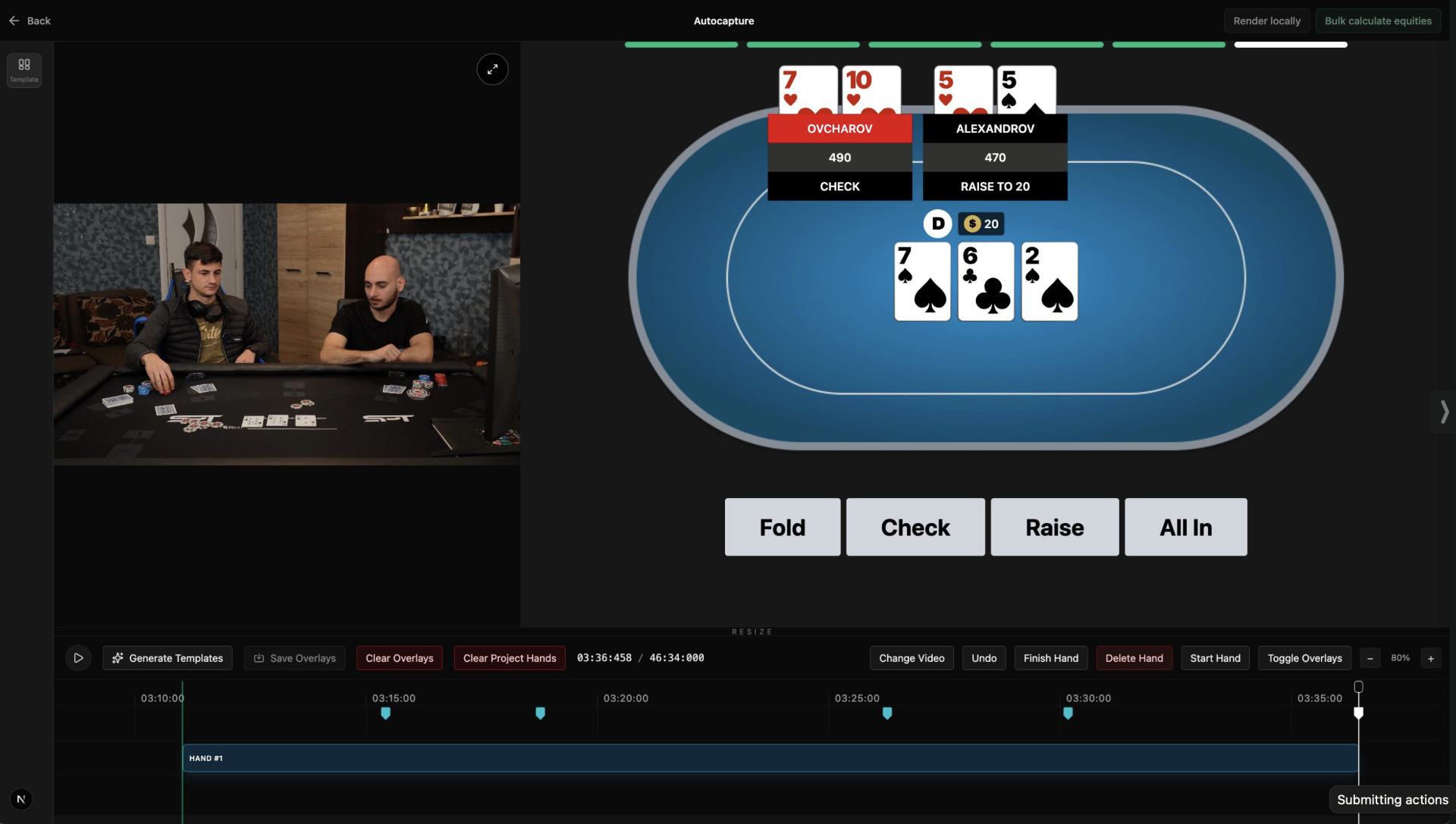 SPT Edittor allow us to generate the graphics required for the poker videos, we simply follow up throught the video and include every single action check, bet, fold etc.. Cards will be automatically included from our computer vision operation